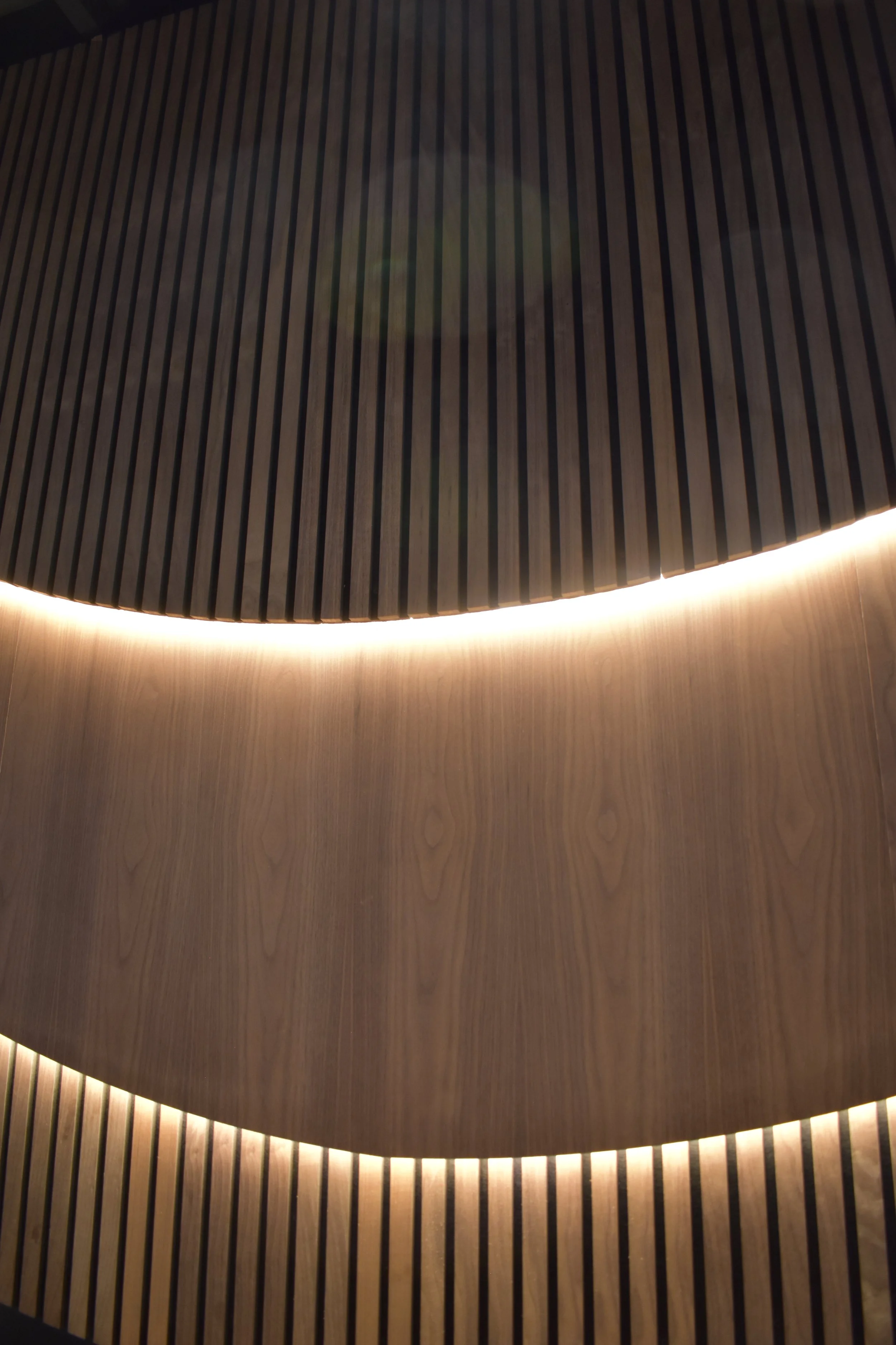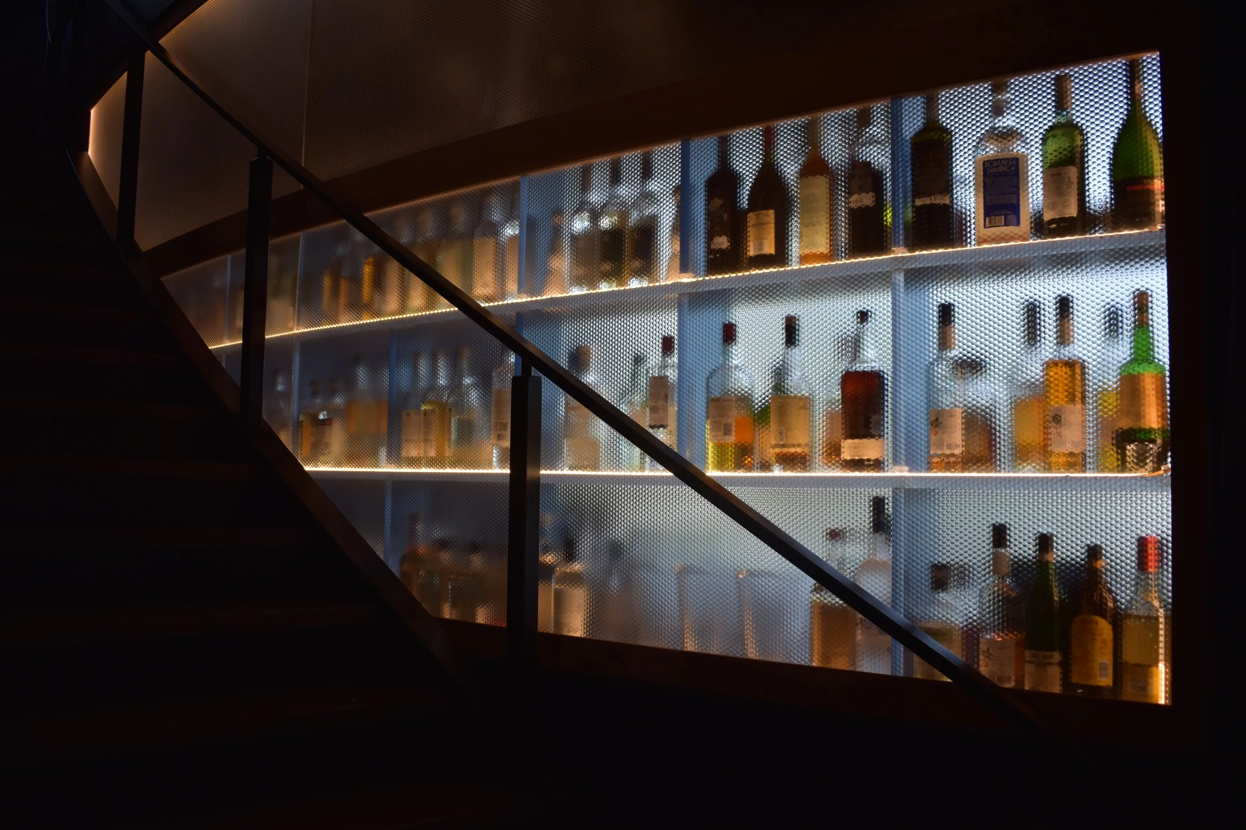 The elevator core and sweeping monumental stair are central design elements that shape the wayfinding experience. They define the bar and lounge, where the flowing curves are reflected in the furnishings and suspended acoustical baffles adorning the ceiling. Backlit translucent panels act as a divider between the stairwell and the bar, adding illuminated texture and creating a visual link between the two spaces.