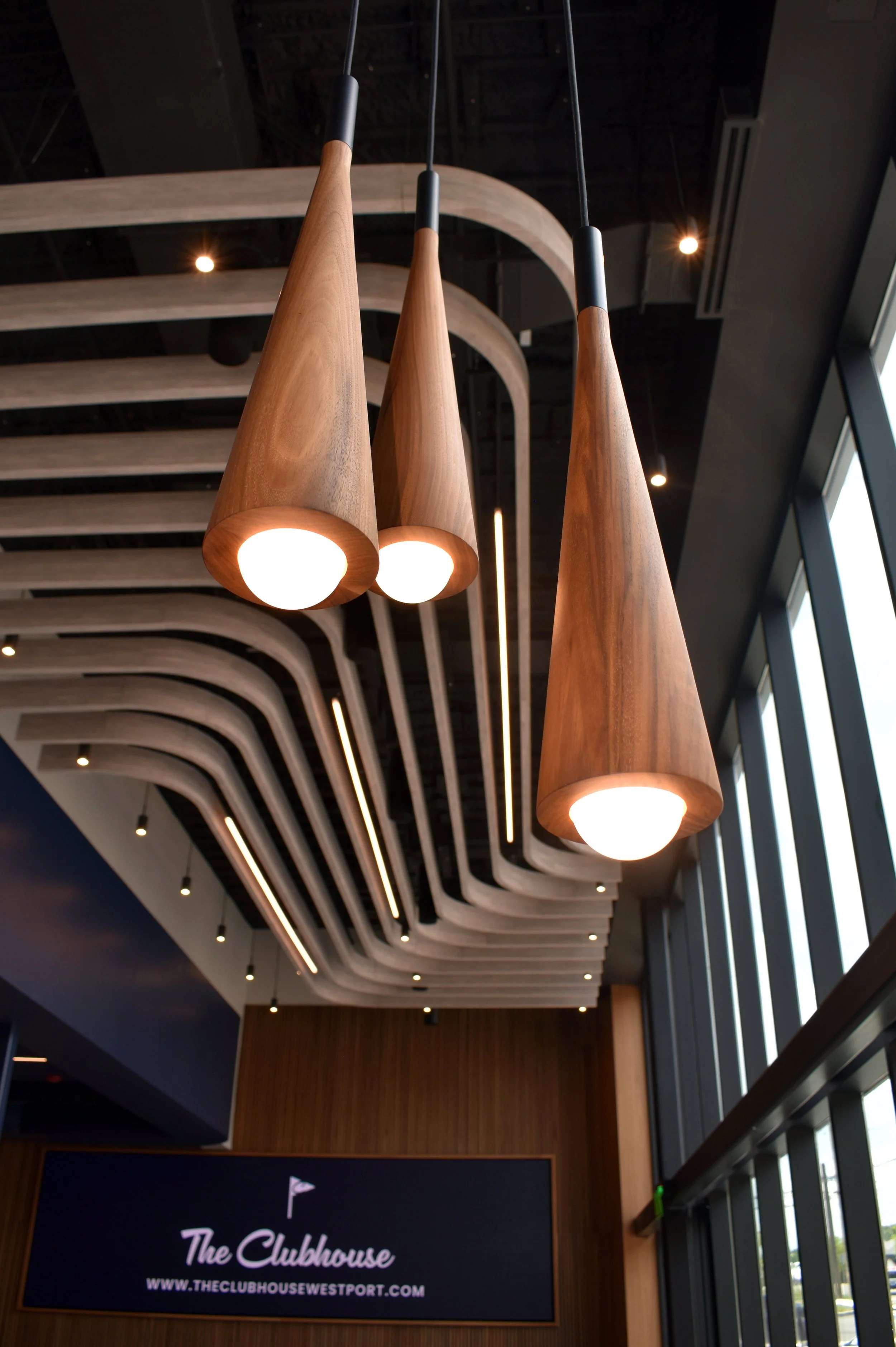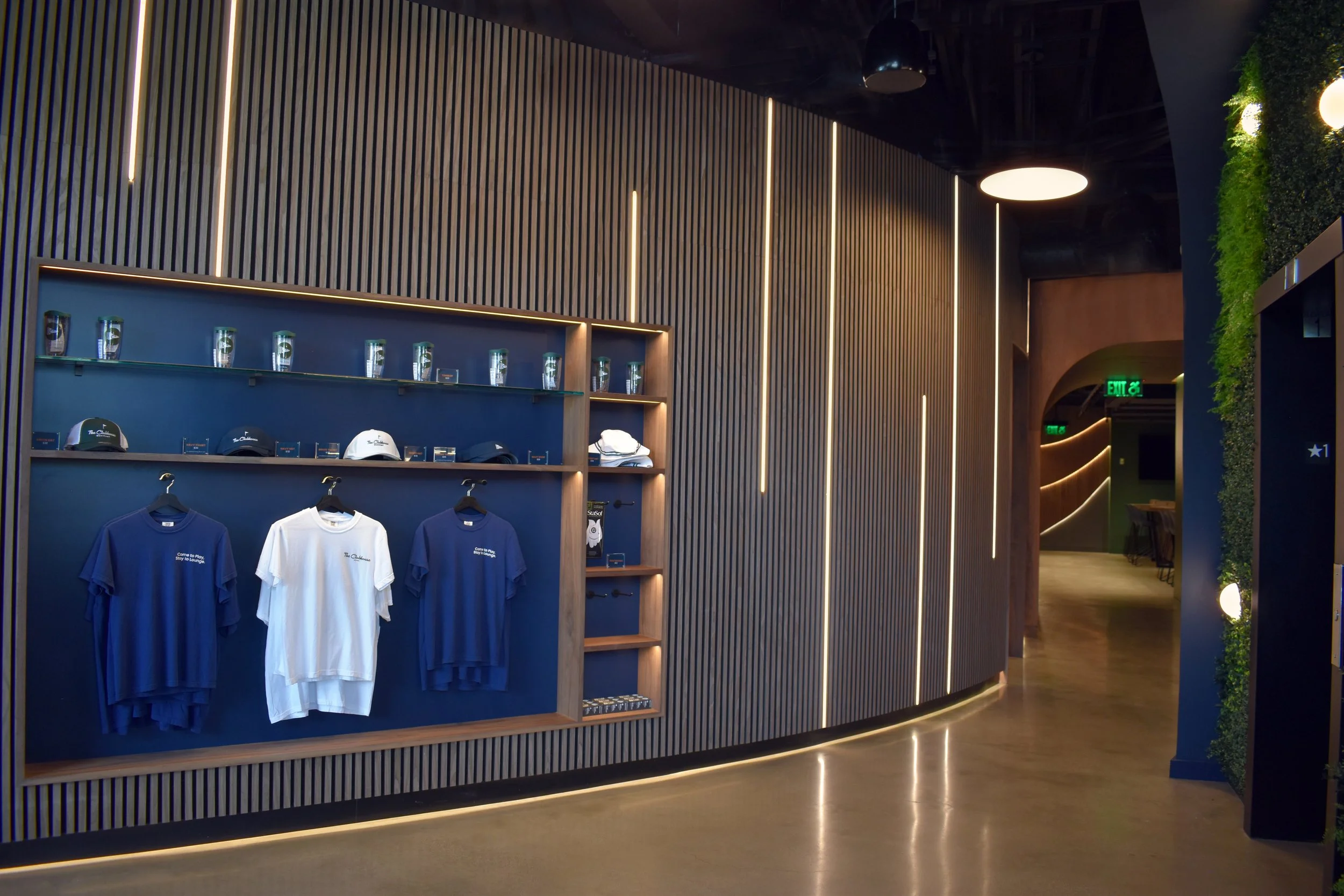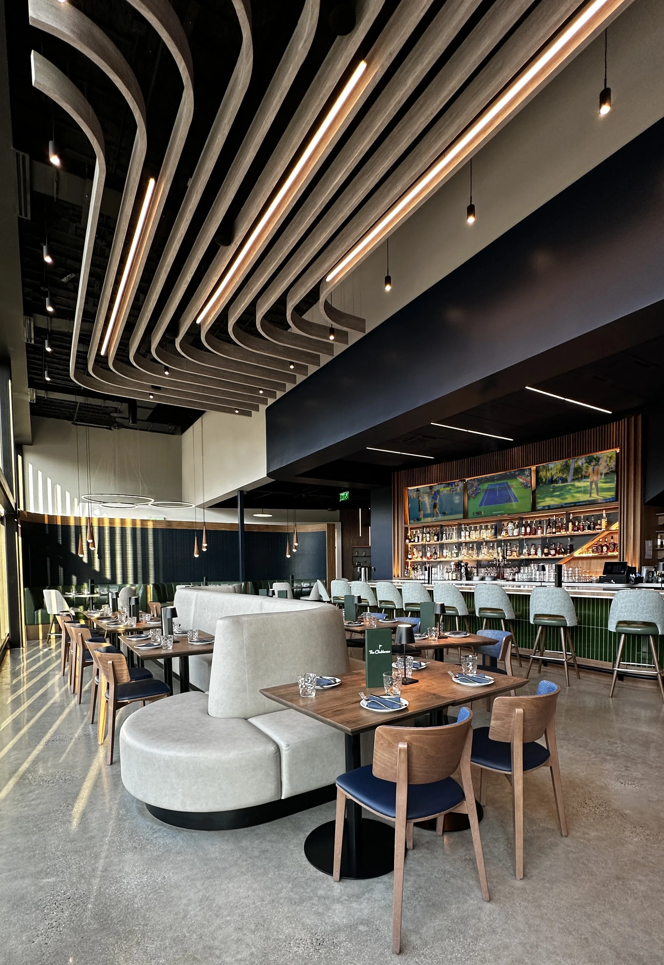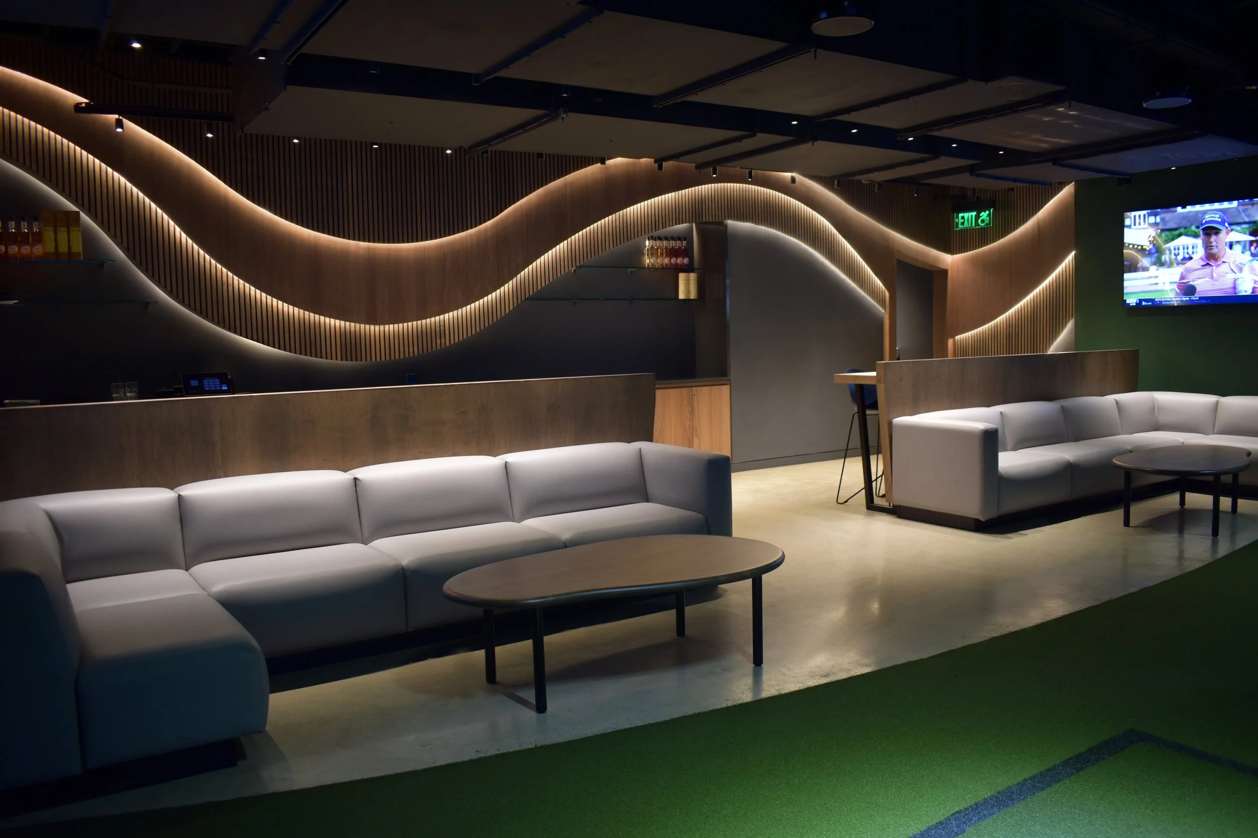 The Clubhouse’s program was challenging; with ambitions to offer a wide range of activities and attract diverse clientele within a vibrant, energetic environment. The main activity area includes six indoor golf and multi-sport simulator bays, two private multi-use karaoke rooms, two dart bays, and a full-service restaurant and bar. Additional amenities feature a fully accessible open-air roof deck bar and lounge with firepits, along with a cornhole green. Curves integrated into the spatial plan affirmed within aesthetic detailing, connect the program spaces and embody the energy and fluidity of a golf swing. The Clubhouse brand, a contemporary expression of the country club aesthetic, is showcased with rich woods, abstracted tartan textiles, lush green walls, vibrant lighting, and state-of-the-art AV technology.