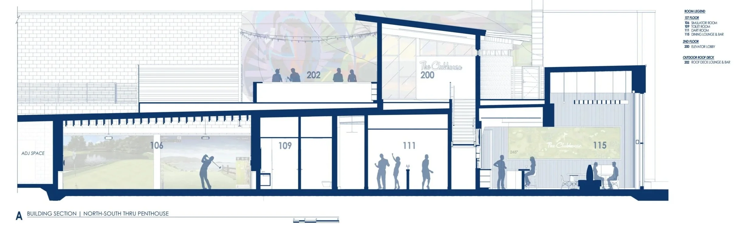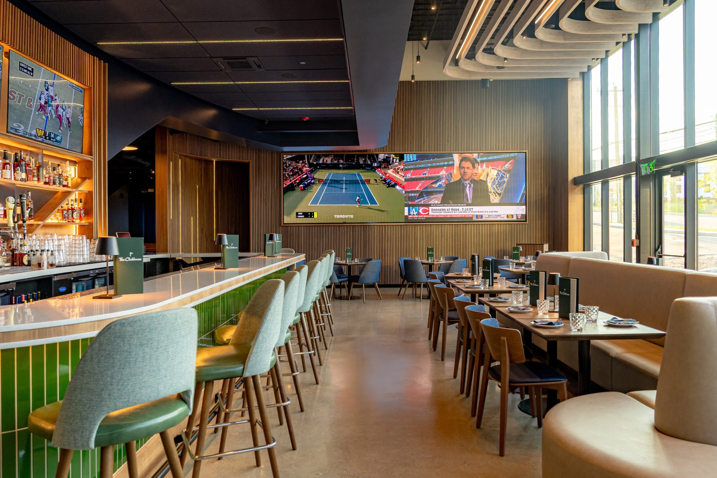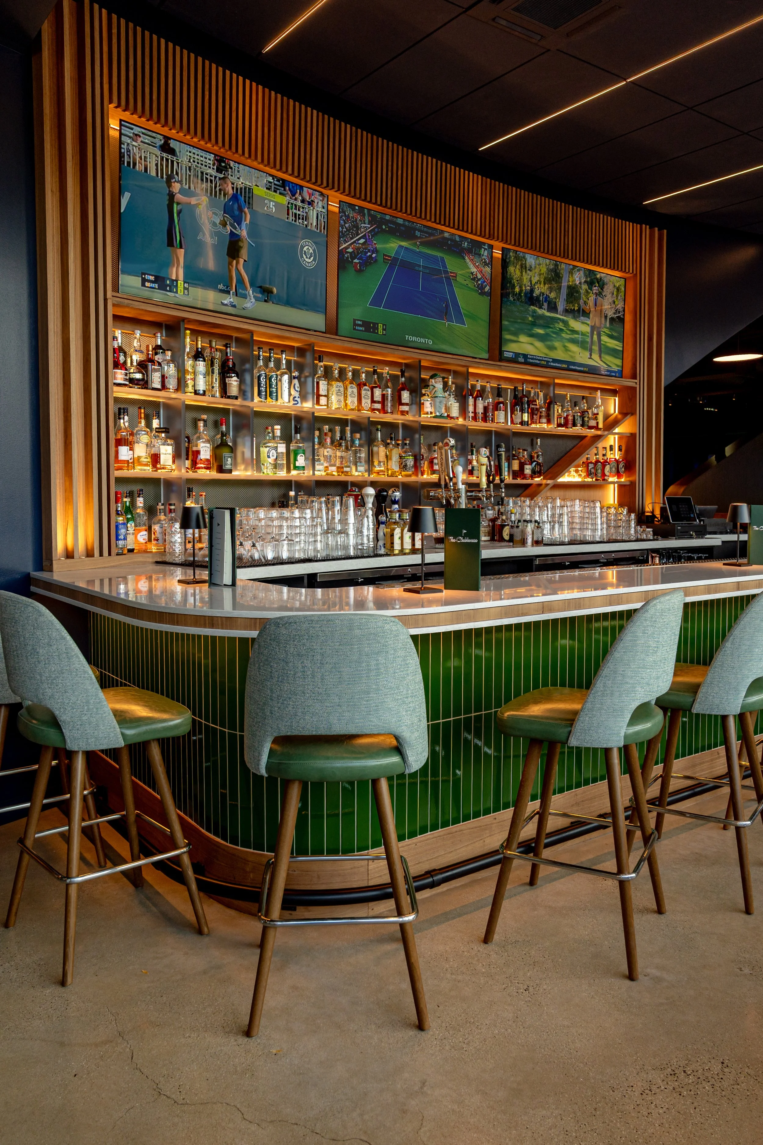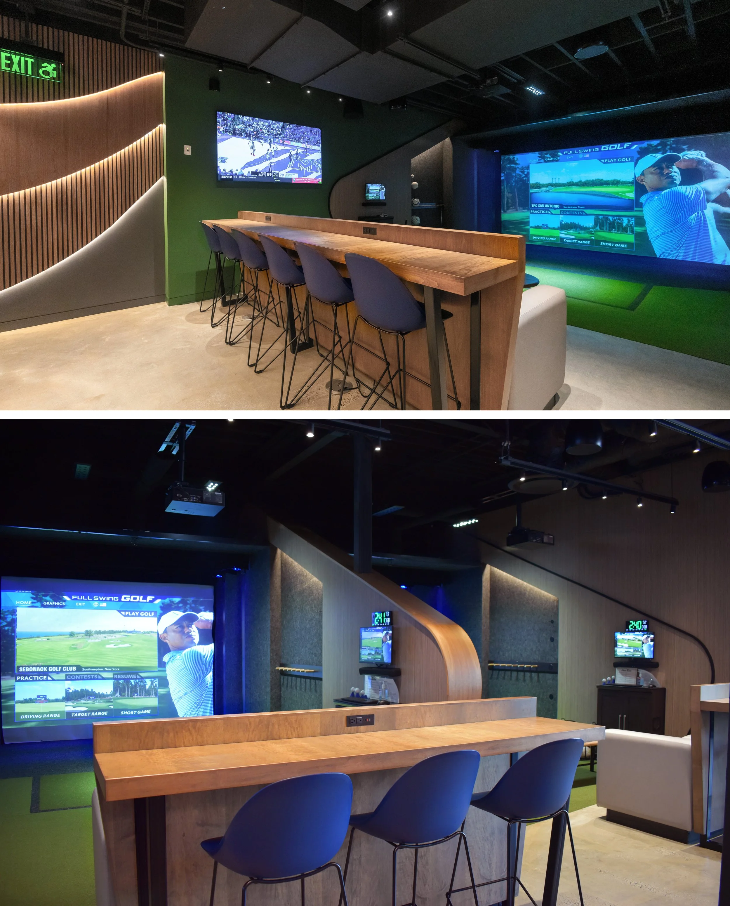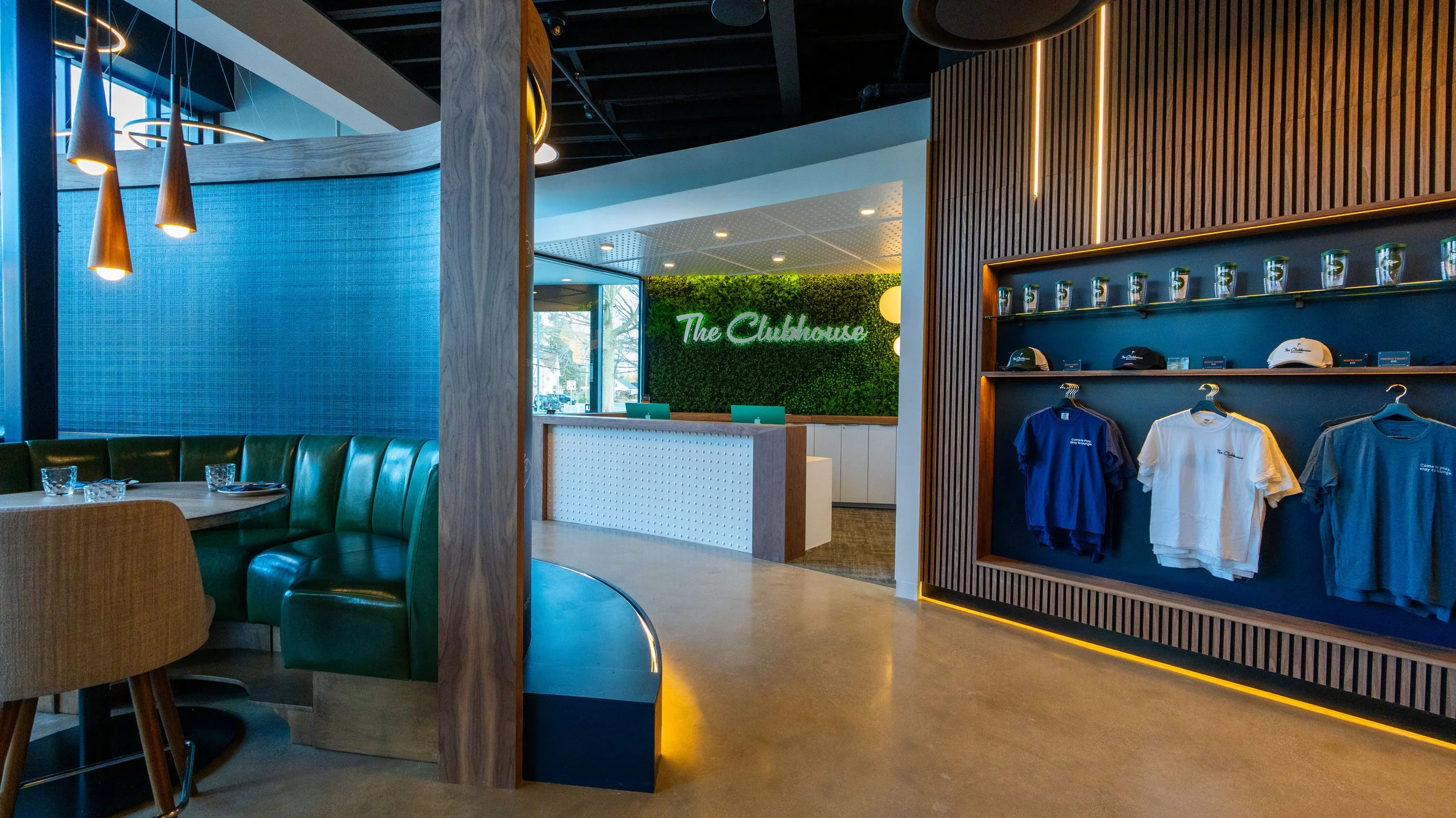 The golf simulators, while open and visible to observers, offer users privacy with their swing-inspired partitions and built-in storage for sports equipment. From the multi-sport simulators to the dart bays, karaoke rooms, and the food & beverage lounge area, The Clubhouse provides a lively community gathering spot for people of all ages and backgrounds to enjoy a variety of social activities and events, regardless of the weather, season, or individual athletic abilities.