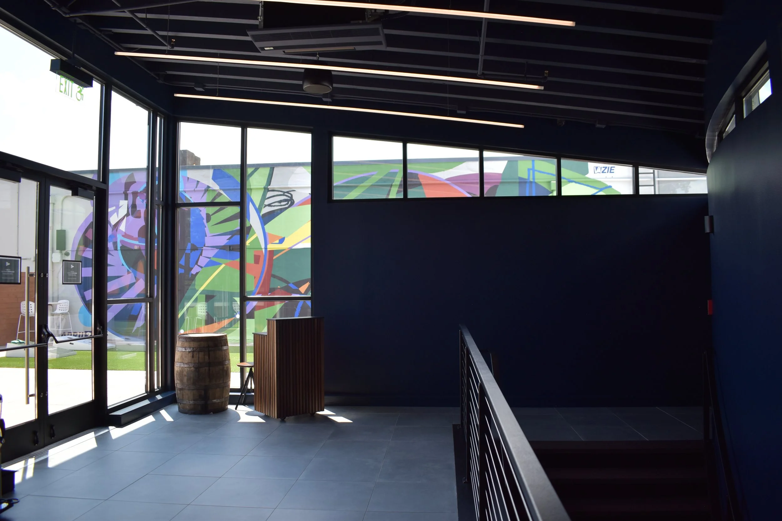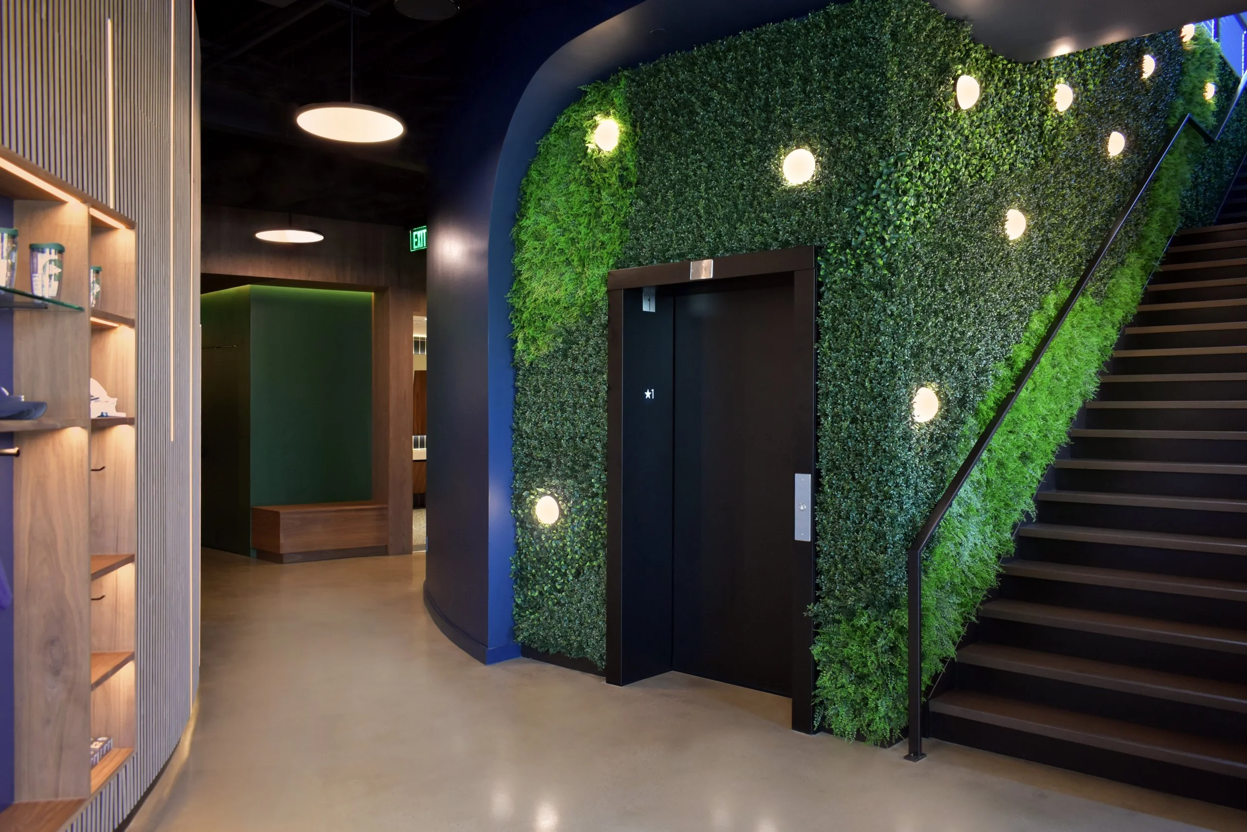 Tucked behind the bar room, the sweeping monumental stair accented with an illuminated green wall invites patrons upstairs to the color-drenched penthouse roof deck lobby, where they are enveloped by the “Clubhouse” Blue dramatic, pitched, exposed roof structure and walls. Purposeful fenestration offers glimpses of playful murals, luxurious lounge areas, and the full-service bar, which become visible as patrons ascend the stairs. The roof deck provides a vibrant outdoor extension of the program space, offering a unique outdoor hospitality experience in Westport.
