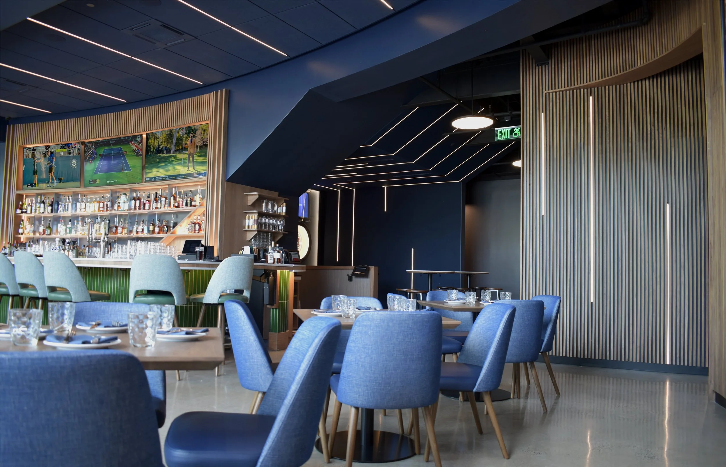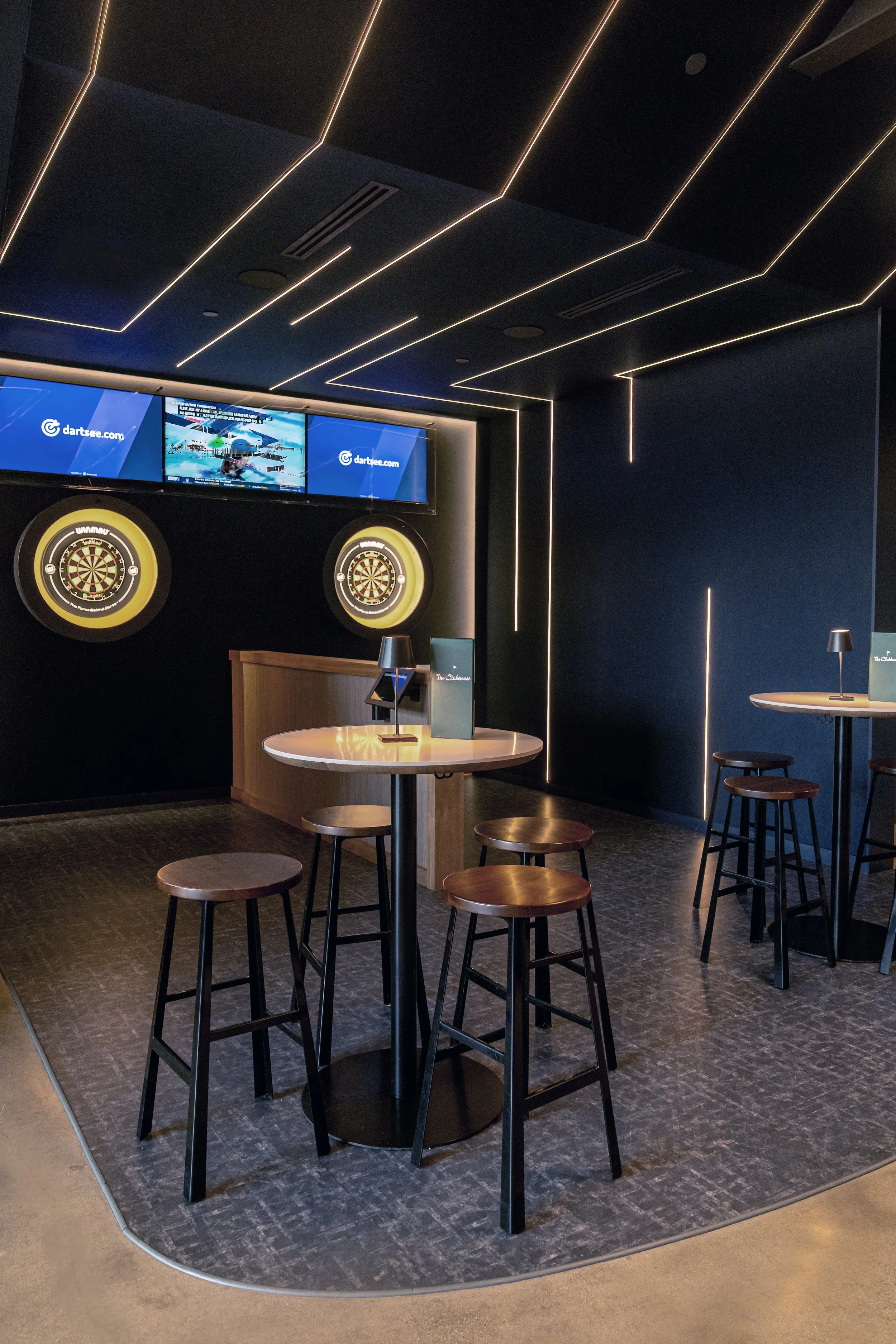 Interconnected and central to each program area, the bar and lounge visually dissolves into the adjacent activity zones. Carved from the interstitial space between the bar room and the simulator bay, the blue color-drenched dart bays feature ceilings and walls wrapped with “self-healing” felt wall coverings and integrated linear LED accent lighting. The incline of the monumental stair is celebrated within the backbar, and the sloping plane continues to shape the ceiling of the dart bay, reinforcing the connectivity of the spaces and activities.